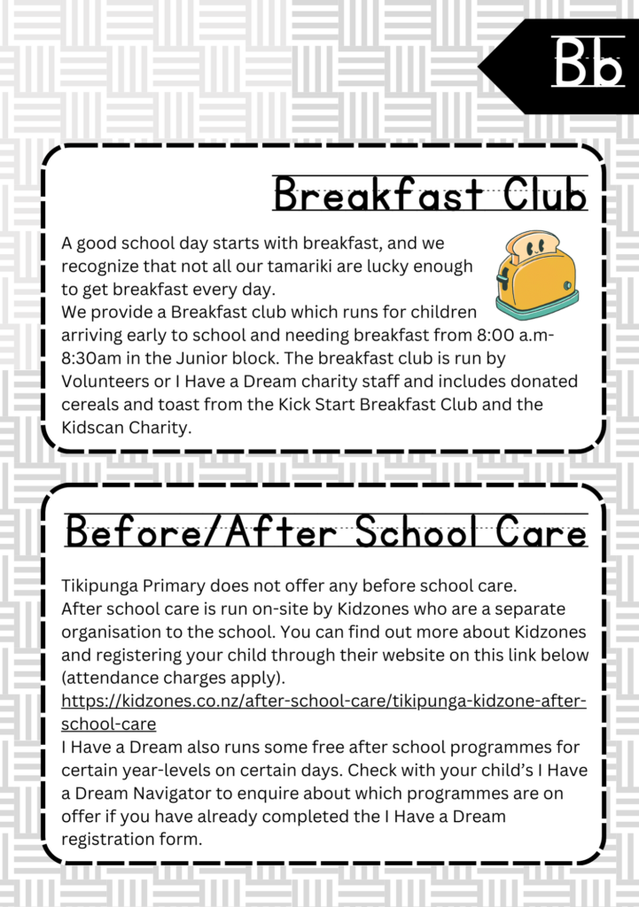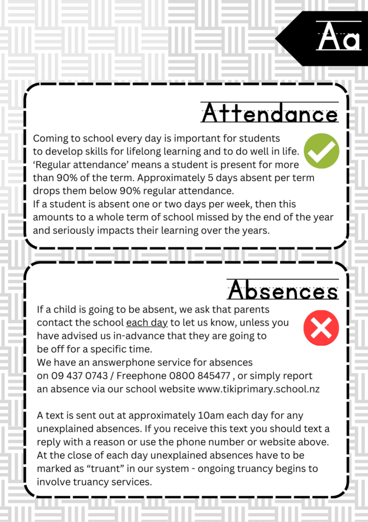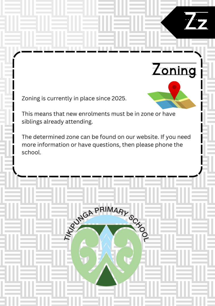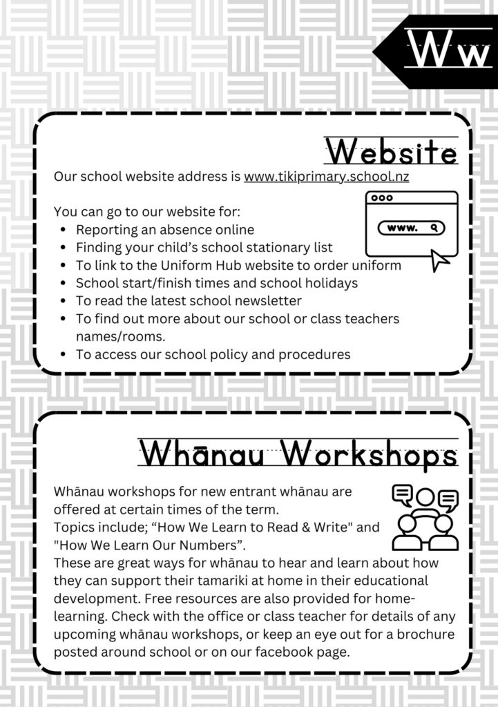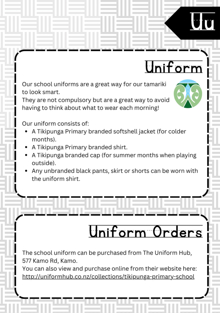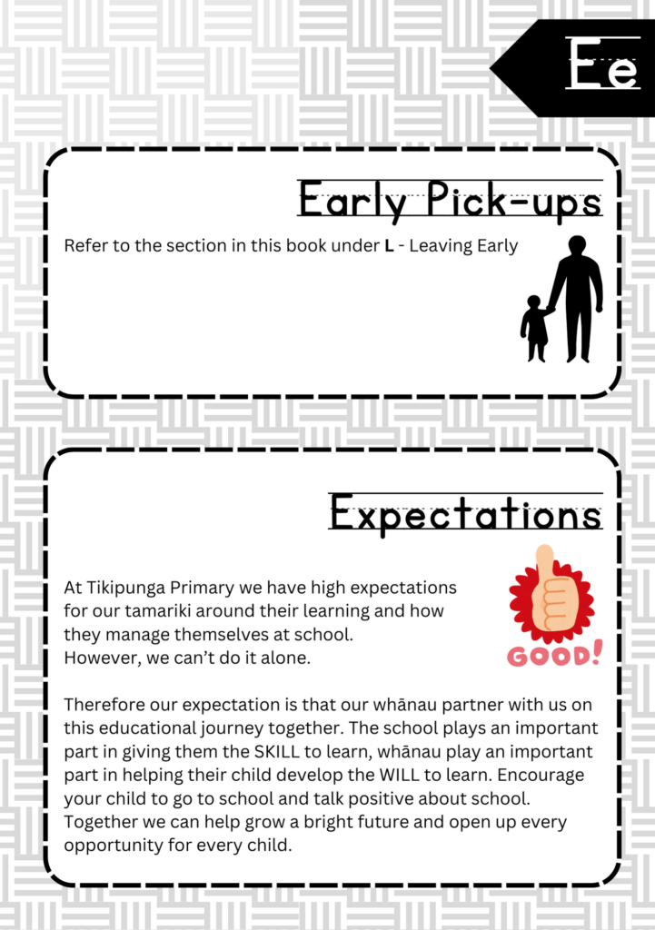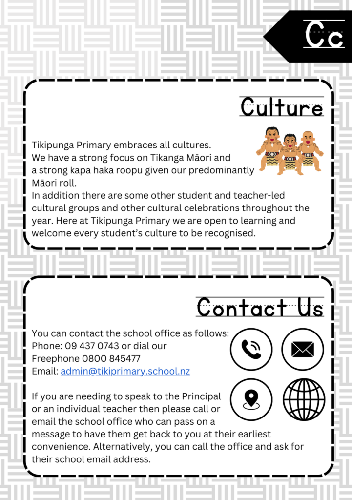 Welcome to the ABC’s of Tikipunga Primary. This is a complete Whānau Information Handbook featuring everything you and your child need to know when your tamariki are first starting their journey with us at Tikipunga Primary School.
